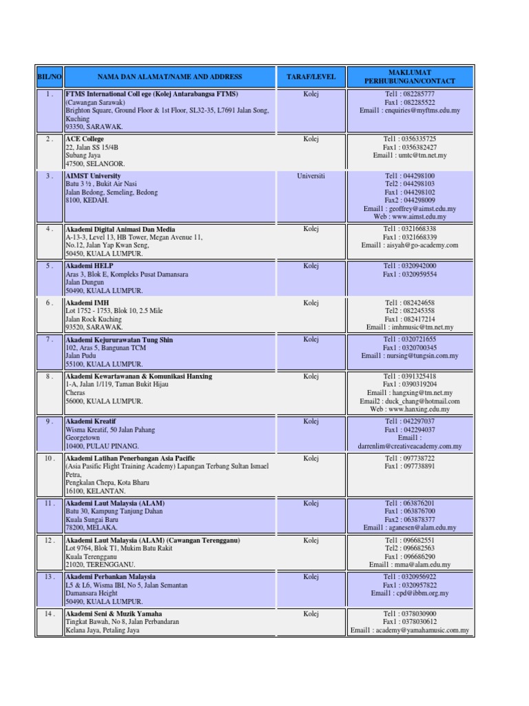 Seperti institut latihan industri,kolej komuniti,institut kemahiran mara dan bnyk lagi. Kolej universiti islam antarabangsa selangor. 205.kolej kejururawatan dan sains kesihatan sime darby. Kolej universiti metropolitan kuala lumpur (klmuc). About kolej antarabangsa teknologi & profesional.