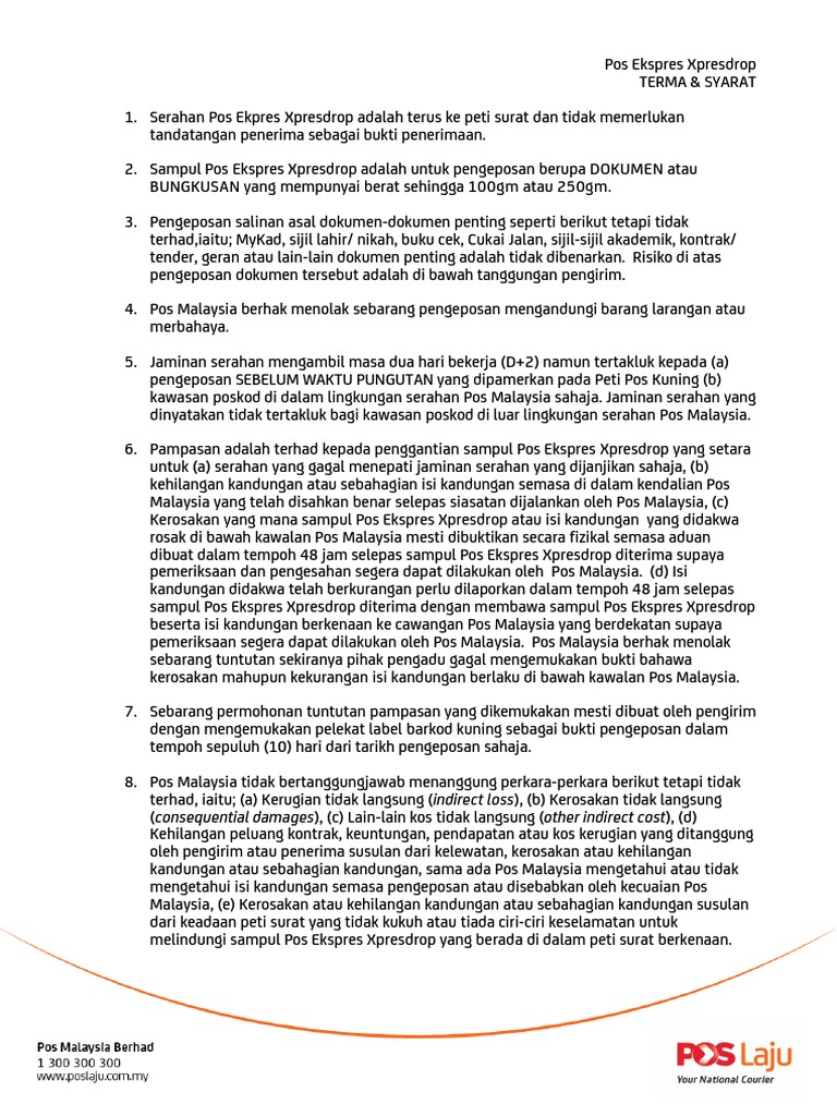 Poslaju tidak akan melayani tuntutan yang dikemukakan selepas tempoh 30 hari dari tarikh pengeposan, (b) dikemukakan secara bertulis bersama bukti pengeposan dan salinan pengenalan diri yang sah, (c) diserah kepada cawangan poslaju berhampiran.
