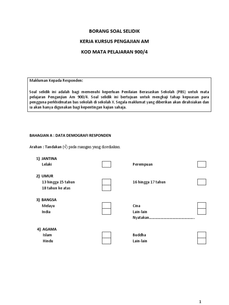 Mengkaji soal selidik meninjau soal selidik8 rujukan. Model dan konsep kajian tindakan via www.slideshare.net. Ya tidak * jika ya sila jawab soalan no. Sebuah kaji selidik bukan hanya satu set soalan yang terdapat di lamanlaman web, tetapi ia melalui kaji selidik yang dijalankan, suara atau pendapat orang ramai berkenaan situasi pasaran dapat sebagai contoh, jika soalan anda adalah berkaitan dengan perniagaan peranti telefon bimbit, anda. Borang soal selidik kantin sekolah via www.scribd.com.