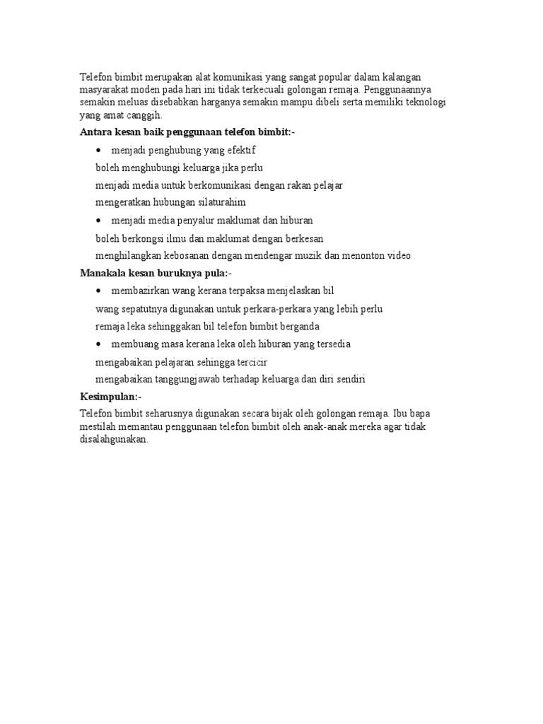 Penggunaan telefon bimbit yang tidak terkawal boleh menyebabkan berlakunya pembaziran. Penggunaan telefon bimbit boleh membantu tambahan ciri ciri keselamatan murid terutama jika mereka ada yang pulang lewat petang. Memang tidak dapat dinafikan bahawa penggunaan telefon bimbit banyak memberikan faedah kepada para pelajar. Telefon bimbit juga semakin canggih hingga boleh melayari laman web dan juga menggunakan perkhidmatan 3g. Ke mana sahaja kita pergi sekarang , tak kira di pusat membeli belah atau di restoran. Namun, adakah penggunaan telefon bimbit ini memberikan kesan yang baik kepada masyarakat terutamanya golongan remaja? Namun, teori radiasi masih belum terbukti lagi. Keburukan penggunaan gajet gajet eletronik di sekolah. Tidur yang berkualiti memberi kesan yang positif kepada keseluruhan fungsi otak dan sistem tubuh manusia. Selain itu, penggunaan media sosial di telefon bimbit boleh menjejaskan kesihatan mental pelajar. Pakar radiasi dari sweden martin roosli berkata pendedahan terhadap radiasi daripada telefon pintar selama setahun sudah cukup untuk memberi kesan buruk kepada bahagian otak yang berfungsi untuk. Radiasi daripada telefon bimbit menjadi kebimbangan utama mengenai kesan penggunaan telefon bimbit terhadap otak. Oleh itu, kita dapat melihat banyak murid yang mempunyai telefon bimbit.