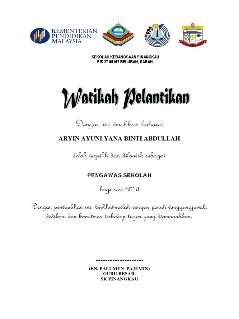 Watikah Pelantikan In English - File Majlis Pelantikan Pengawas Dan Jom Ke Sekolah 2019 Jpg Wikimedia Commons / Save save watikah pelantikan pengawas for later.